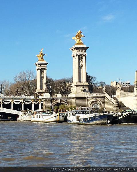 亞歷山大三世橋 Pont Alexandre III,兩端的立柱上有象徵塞納河與涅瓦河的寓意性裝飾金色雕像,很有氣勢 !