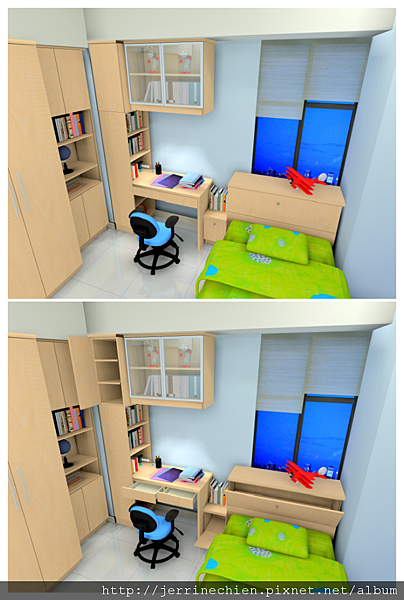 一個小孩成長的空間,不外乎要有的就是床、書櫃、書桌、衣櫃配置,而使用的配置分配男孩房女孩房會有些微的不同。當然依現場與需求狀況,可以變化出不同符合需求的獨立空間。